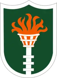 The most common unit insignia worn by KComZ personnel depicted an orange flame in a white bracket at the centre of a green shield. A less common variant, also shaped like a shield, depicted the letters KCOMZ diagonally in white on a green background.