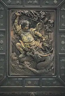 Declaring himself winner of the trial, Susanoo then began to wreak havoc upon Takagamahara,[13][14] causing Amaterasu to hide herself in the Ama-no-Iwato, plunging heaven and earth into darkness.[15][16] Though Amaterasu was eventually persuaded to come out of the cave, Susanoo was banished a second time as punishment for his misdeeds.[17][18] He then came down to Ashihara-no-Nakatsukuni (the 'Central Land of Reed Plains', i.e. the earthly land of Japan), to the land of Izumo, where he slew the eight-headed serpent Yamata-no-Orochi and married Kushinada-hime. At length, Susanoo went to the underworld (Ne-no-kuni) to become its ruler.[19][20][21][22]