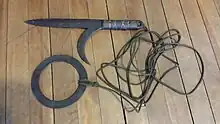 The kyoketsu-shoge (Japanese: 距跋渉毛)[1] is a double-edged blade, with another curved blade attached near the hilt at a 45–60 degree angle. This is attached to approximately 10 to 18 feet (3–5 m) of rope, chain, or hair which then ends in a large metal ring. Likely used by ninja of the Iga province, it is thought to be a forerunner to the later more widely known kusarigama (sickle and chain).[2] Ninja were often recruited from the class of rural peasantry who resided on remote farmland, and the tool's resemblance to farming equipment and high versatility gave it many benefits in stealth combat.[3]