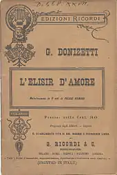 L'elisir d'amore (The Elixir of Love, pronounced [leliˈzir daˈmoːre]) is a melodramma giocoso (comic melodrama, opera buffa) in two acts by the Italian composer Gaetano Donizetti. Felice Romani wrote the Italian libretto, after Eugène Scribe's libretto for Daniel Auber's Le philtre (1831). The opera premiered on 12 May 1832 at the Teatro della Canobbiana in Milan.