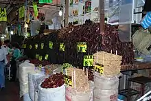 The La Merced Market is a traditional public market located in the eastern edge of the historic center of Mexico City and is the largest retail traditional food market in the entire city.[1] The area, also called La Merced, has been synonymous with commercial activity since the early colonial period when traders arrived here from other parts of New Spain. At one time, nearly the entire neighborhood was filled with market stalls and in the 1860s it was decided to build a permanent market on the grounds of the old La Merced monastery. In the first half of the 20th century, this market was the major wholesaler for the entire city.[2] This ended when the Central de Abasto was opened in the 1980s, but La Merced remains the largest traditional retail market.[3] The market area is also known for flagrant prostitution in which women can be seen soliciting at all hours of the day and night. It is estimated that about one third of these prostitutes are underage.[4]