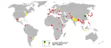 Nepal has a labour force of 16.8-million-workers, the 37th largest in the world as of 2017.[1] Although agriculture makes up only about 28 per cent of Nepal's GDP, it employs more than two-thirds of the workforce.[2] Millions of men work as unskilled labourers in foreign countries, leaving the household, agriculture, and raising of children to women alone. Most of the working-age women are employed in agricultural sector, contributions to which are usually ignored or undervalued in official statistics. Few women who are employed in the formal sectors face discrimination and significant wage gap. Almost half of all children are economically active, half of which (almost a quarter of all children) are child labourers. Millions of people, men, women and children of both sexes, are employed as bonded labourers, in slavery-like conditions. Trade unions have played a significant role in earning better working conditions and workers' rights, both at the company level and the national government level. Worker-friendly labour laws, endorsed by the labour unions as well as business owners,[3] provide a framework for better working conditions and secure future for the employees, but their implementation is severely lacking in practice.[4] Among the highly educated, there is a significant brain-drain, posing a significant hurdle in fulfilling the demand for skilled workforce in the country.