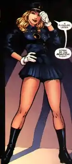 Blake continues to wear her own version of the Blackhawks uniform in Birds of Prey, which consists of a blue tunic, military cap, frilled miniskirt and boots. In her early appearances she was drawn wearing blue tights.