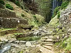 A view of either bank of the Ribeira de Aveiro (with the lagar centred), showing the waterfall of Aveiro in the right background