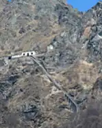 During 20s, four plants were built in order to transport the materials from the valley floor to the Barbellino wide valley. The first cableway started from Valbondione town and used to reach Antonio Curò shelter. It was 4,5 km long and had 1000 m (3280.84 ft) of difference in height, carrying a maximum of 10 ton of material. A second cableway was built from the valley floor Grumetti up to Mount Pinnacolo with 1,2 km length and 800 m (2624.67 ft) of difference in height. The heaviest materials were carried with this cableway since it could transport up to 3000 kg materials. Once reached the Pinnacolo, the materials were loaded up to a small train passing through a tunnel which led to Valmorta dam. The third cableway was built in parallel to the first one making the same way but carrying only cement materials. To conclude, another slope cableway was built to bring workers from the valley floor upwards. It worked till 70s, when a new funicular railway was built.[11]