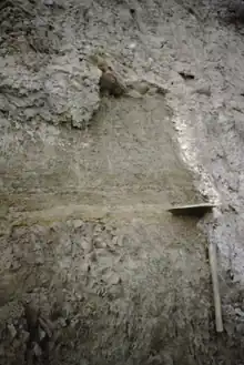 Bonneville flood bed in Lake Bonneville marl at an exposure in northern Utah. The base of the flood bed is at the level of the shovel blade. For scale, the shovel handle is about 20 in (50 cm) in length.