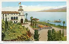 The Clevelin Country Club (later known as the Lake Elsinore Country Club, The Spa Club and the Casino Del Elsinore) was built to be the main attraction of the Country Club Heights subdivision.[34] Prominent members of the club included Mrs. Wallace Reid, Marie Prevost, Reginald Denny, Jack Dempsey, Bert Lytell, Damon Runyon and Joe Stecher, for whom the streets are so named[35] This Spanish-Mediterranean Moorish accented architectural masterpiece had over 20,000 square feet of floor space and included a ballroom, banquet hall, sleeping quarters, and a tunnel system to hidden rooms. The Country Club closed during the depression, but reopened in 1951. It has closed again before 1981, at which point restoration work was being undertaken, but by 1990 the property was vacant and derelict.[34] The Country Club succumbed to arson in 2001.[36]