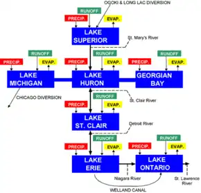 The largest inflow to the system is the St. Mary's River from Lake Superior, and the main outflow is the St. Clair River toward Lake Erie; both lie in the Lake Huron basin.[14][3] The combined effects of seiches (resonant standing waves)[15] and of differing weather conditions (atmospheric pressure, wind)[14] over each basin act to drive water either way through the Straits on a variety of characteristic timescales, at amounts sometimes exceeding 75,000 m3/s (2,600,000 cu ft/s) for several hours in either direction.[15] However, the long-term average flow through the Straits is eastwards at 1,500–2,000 m3/s (53,000–71,000 cu ft/s), toward the outlet of the St. Clair River.[15] Flows into the system from Lake Superior are controlled by the bi-national Lake Superior Board of Control through the operation of locks and canals.[16]