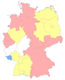 In Baden-Württemberg, Rhineland-Palatinate (southwestern part only), North Rhine-Westphalia (Westphalia), Mecklenburg-Western Pomerania, Brandenburg, Saxony-Anhalt, and Berlin, the Landesliga is the seventh tier, below the Verbandsliga. In the Saarland, the Landesligas are set as the eighth tier.[1][2][3]