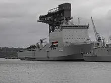 A dock landing ship (also called landing ship, dock or LSD) is an amphibious warfare ship with a well dock to transport and launch landing craft and amphibious vehicles.[1] Some ships with well decks, such as the Soviet Ivan Rogov class, also have bow doors to enable them to deliver vehicles directly onto a beach (like a tank landing ship). Modern dock landing ships also operate helicopters.