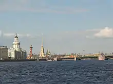 The ensemble of Peter and Paul Fortress with the Peter and Paul Cathedral takes dominant position on the right bank of the Neva river, across the Winter Palace in the center of the city. A boardwalk was built along a portion of the fortress wall, giving visitors a clear view of the city across the river to the south. On the other bank of the Neva, the spit (Strelka) of the Vasilievsky Island is graced by the Old Saint Petersburg Stock Exchange (Bourse) (1805–1810), an important landmark in the style of the Greek Revival, is now home of the Russian Naval Museum. The spit of the Vasilievsky Island is designed as a classic lawn-park on the waterfront, and is highlighted by two tall and colorful Rostral Columns, decorated with statues and prows of battleships. This is a traditional place for music festivals and public events, such as the White Nights Festival.