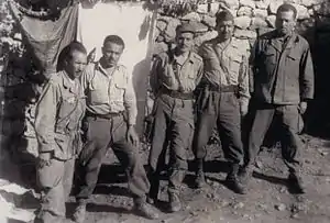 Ben M'hidi became a follower of Messali Hadj and was a member of Messali's Algerian People's Party (PPA) during World War II, rapidly obtaining significant responsibilities within the movement. Ben M'hidi was arrested the following day[8] after the Sétif uprising against the occupying French forces in May 1945.[9] The uprising was suppressed through what is now known as the Sétif massacre. He was arrested in Biskra and imprisoned in the Coudiat prison in Constantine for four months.[1][10] The massacres committed by the French army in Setif, Guelma and Kherrata had completely shocked him. On 15 March 1946, Ben M'Hidi was released from prison due to an amnesty being granted to the majority of nationalists imprisoned for the 1945 riots.[11] The PPA was disbanded following the 1945 Sétif riots, and was replaced in October 1946 by the Movement for the Triumph of Democratic Liberties (MTLD), also headed by Messali Hadj. In 1950, Ben M'hidi had been convicted in absentia and sentenced to 10 years in prison.[8] Ben M'hidi and eight other members of this movement soon grew impatient with Hadj, and decided to form the Revolutionary Committee of Unity and Action (CRUA), on 30 March 1954. During May and June 1954, they decided that Algeria would be split into five areas; Ben M'hidi was assigned Zone 5, Oran.[12] On 10 October, Larbi Ben M'hidi and five other members of the CRUA approved the transformation, thus giving birth to the National Liberation Front (FLN) and the National Liberation Army (ALN). At a meeting at the Climat de France, a house overlooking Bab El Oued, the FLN decided to launch an insurrection, which broke out in the early morning of 1 November 1954, and quickly escalated into the Algerian War. The outbreak soon became known as "Toussaint Rouge" (Red All Saints Day) as it coincided with the Catholic festival.[13] The rebellion was conducted internally by Ben M'hidi, Mourad Didouche, Rabah Bitat, Krim Belkacem, Mohammed Boudiaf, and Mostefa Ben Boulaïd, while three more members (Hocine Ait Ahmed, Ahmed Ben Bella, and Mohammed Khider) were operating externally in Cairo. They later became known as "The Men of November".