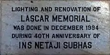 In 1994, commodore B K Mohanti spotted the ruined and neglected Lascar War Memorial overgrown with vegetation during his morning walk. Recognising the importance of the monument,[2] Mohanty arranged for funds for the renovation of the memorial. The renovation and lightning was completed in December 1994. A.L. Dias, then Governor of West Bengal, switched on the illumination on 7 December 1994[1] on the occasion of the 40th anniversary of INS Netaji Subhas.