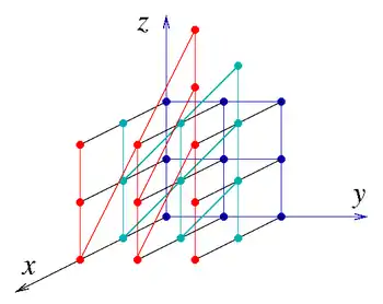 A portion of the discrete Heisenberg group, a discrete subgroup of the continuous Heisenberg Lie group. (The coloring and edges are only for visual aid.)