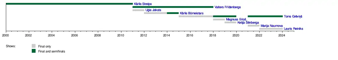 | 2023 | Toms Grēviņš (all), Lauris Reiniks (final) | Jānis Pētersons |