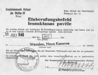 Under the Rosenberg labor decree of December 1941, the Germans had already begun conscripting Latvians in early 1942, giving them a choice of joining the labor service or police battalions.[11] One month after the unit was founded, German occupation authorities in Latvia started conscripting military age men specifically for the Legion. Draftees were given a choice between serving in the Wehrmacht-subordinated Waffen-SS Legion, serving as German Wehrmacht auxiliaries, or being sent to a slave labor camp in Germany. Those who tried to avoid one of those options were arrested and sent to concentration camps.[12] As a result, only 15-20% of the men serving in the legion were actual volunteers.[6] Unlike in Lithuania, potential legionary recruits in Latvia did not organize an official boycott of conscription; some Latvians deserted however rather than serving the Nazi war effort.[1]