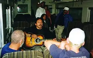 Lawrence Martin aka Wapistan playing guitar and singing on board of Polar Bear Express.