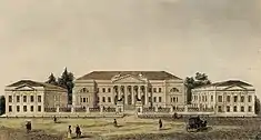 By 1823 the main building acquired its present-day shape; an obelisk in the rear courtyard, raised in 1822, was cast of pig iron produced at Lazarev's iron mills in Perm (later, the obelisk was moved into the front courtyard). In 1828 Lazarev purchased adjacent building (2, Armyansky Lane) and converted it to an Armenian printshop.[1] This corner lot has been previously owned by Saltykov and Nesvitsky families. New property remained unchanged until the 1850s, when Pyotr Grigoriev (son of Afanasy Grigoriev) rebuilt it to match the main building. Subsequent restorations retained the street facades, but removed Grigoriev's finishes on the side wall, revealing 17th-century brickwork.