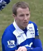 In January 2009, Bowyer signed for Birmingham City on loan until the end of the 2008–09 season.[33] He made his debut on 17 January at home to Cardiff City in the Championship, scoring an equalising goal in the fourth minute of stoppage time to make the score 1–1.[34] Following the expiry of his contract with West Ham United, Bowyer signed a two-year contract with Birmingham in July 2009.[35] He scored winning goals in consecutive Premier League matches, against Fulham and Wolverhampton Wanderers, to take Birmingham into a mid-table position at the end of November,[36][37] and was part of the team that went on a run of 15 games unbeaten in all competitions, including a club record 12 unbeaten in the top flight,[38] as they finished in ninth place, the club's best for more than 50 years.[39]