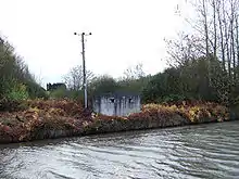 The canal suffered some damage during the Second World War. It was breached when a German bomb fell on it in Bootle.[15] The canal in West Lancashire was part of Britain's defensive plans against invasion. Along the canal there were tank traps, bunkers and blockhouses. Some buildings such as barns and pubs along the canal were fortified. There are still some remaining concrete pillboxes and brick built blockhouses.[16]