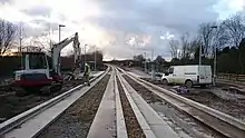 Site clearance for the dedicated busway section between Leigh and Ellenbrook took place between November 2012 and March 2013.[50] Balfour Beatty began its construction in September 2013.[51] A short section of the busway west of Newearth Road was completed in early 2015 and in the April was used for a trial of the construction method and the bus guidance system. Following delays due to bad weather and other problems, the busway works were rescheduled to be completed before the end of 2015. The service began on 3 April 2016[36] to coordinate with associated road and tram works in Manchester city centre.[52][53]