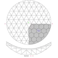 A unique feature of the Leighton telescopes is that the primary is fabricated as a single 10.4 m diameter precision surface, rather than individually machined panels. The dish panels are made of a light weight (15 kg/m3) aluminum honeycomb material with vertical channels. To produce the reflector's parabolic shape, the panels were assembled atop the same steel tube space frame that will support the panels on the deployed telescope. The space frame was mounted on an air bearing surrounding a central mast. An arm extended from the central mast, which had a parabolic track on the bottom side. The parabolic track was shaped by a laser metrology system that made use of the fact that a parabola is the locus of points equidistant from the focal point and a directrix line. The directrix in this case was the upper side of the arm. After the parabolic track was created, a cutting tool moved along the track, and cut the honeycomb panels as the dish rotated on the air bearing. After the honeycomb panels were cut to the proper parabolic shape, an aluminum skin was applied to each panel, to provide the dish's reflecting surface.[5]