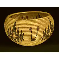 Lena was known for her incredibly tight weaves during what is referred to as the "fancy basketry" period of Washoe art.[4] For the Washoe tribe, basket weaving has served as a practical and artistic purpose for centuries.[4][5] Because of the arid weather of Nevada and California, the Washoe people had to remain mobile, and these woven baskets, known as degikup, were a lightweight and durable way to transport goods during these transitory periods.[5][6] The baskets are built from young willow shoots, fern roots for black designs, and western redbud (Cercis occidentalis) for red designs.[4][5] To create the basket requires an awl, knife, and a container of water to soak and soften the fibrous plant matter.[5] Different designs were used to indicate stories, histories, or various messages.[5][7]