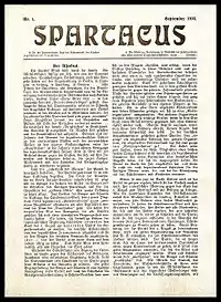 Following the jailing for their anti-war efforts of Liebknecht in May 1916 and Luxemburg that same July, Jogiches took over as the leader of the organization's underground activity.[38] As leader of the underground organization it was Jogiches that oversaw the publication of the official newsletter Spartacus, launched in September 1916, which gave a new name to the faction — the Spartakusbund, rendered into English as the Spartacist League.