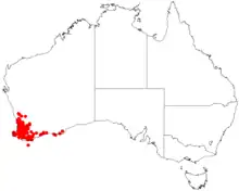 The species is found in the Southwest Australia region, in a variety of soil types. They occur on slopes, on black and grey sands, lateric and peaty soils, or clay, and on gravel.[1]