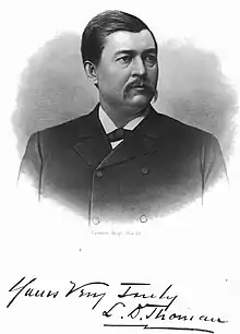 Thoman became involved with Democratic politics in Ohio and, in 1880, presided over the party's state convention.[2] That same year, he ran for Congress in Ohio's 17th congressional district against William McKinley, but was unsuccessful.[2] He retired from the bench in 1882 and resumed his law practice, representing the Pittsburgh & Lake Erie Railroad. The next year, after the passage of the Pendleton Civil Service Reform Act, President Chester A. Arthur nominated Thoman to be one of three members of the United States Civil Service Commission. He served in that office until 1885. In 1887, he moved to Chicago and worked to bring the World's Fair there.[3] Thoman married again to Florence B. Smith in 1892.[2] They had one daughter, Dorothy, born in 1893. Thoman died at his home in Evanston, Illinois, in 1909.[3]