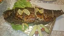 The fish is skinned and washed, and then filled with stuffing after it dries. The belly of the fish is sewed (in order to make the stuffing stay in) and then outside of the fish is rubbed with narsharab or cherry-plum sauce. The fish is baked in the oven until the top of it fries.[6][11] It is served with pieces of lemon, bread and narsharab.[12][13]