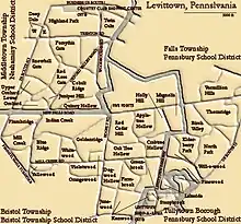 Levittown's 41 neighborhoods[25] (locally called "sections") are found in parts of four separate municipalities: