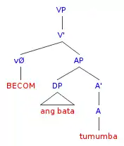 The subunits of Verb Phrases led to the Argument Structure Hypothesis and Verb Phrase Hypothesis, both outlined below.[17] The recursion found under the "umbrella" Verb Phrase, the VP Shell, accommodated binary-branching theory; another critical topic during the 1990s.[18] Current theory recognizes the predicate in Specifier position of a tree in inchoative/anticausative verbs (intransitive), or causative verbs (transitive) is what selects the theta role conjoined with a particular verb.[12]