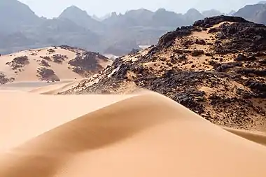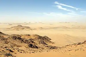 Other features are the Aswad al Haruj (the "Black Desert"), a large circular region of black volcanic shield in the centre of the country, and the Hamada al Hamra (the "Red Desert") a rocky plateau to the west, on the Tunisian border, coloured by iron oxide deposits. To the southeast, between Kufra and the Libya-Egypt-Sudan border, lies the Jebel Arkenu, with the associated Arkenu structures, thought to be caused by meteorite strikes.[1] North of the Gilf Kebir plateau, among the shallow peripheral dunes of the southern Great Sand Sea, is a field of Libyan desert glass. This is thought to be associated with a meteorite impact, marked by the Kebira crater, on the Libya-Egypt border. A specimen of the desert glass was used in a piece of Tutankhamun's ancient jewellery.