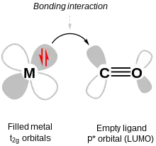 One important π bonding in coordination complexes is metal-to-ligand π bonding, also called π backbonding. It occurs when the LUMOs (lowest unoccupied molecular orbitals) of the ligand are anti-bonding π* orbitals. These orbitals are close in energy to the dxy, dxz and dyz orbitals, with which they combine to form bonding orbitals (i.e. orbitals of lower energy than the aforementioned set of d-orbitals). The corresponding anti-bonding orbitals are higher in energy than the anti-bonding orbitals from σ bonding so, after the new π bonding orbitals are filled with electrons from the metal d-orbitals, ΔO has increased and the bond between the ligand and the metal strengthens. The ligands end up with electrons in their π* molecular orbital, so the corresponding π bond within the ligand weakens.