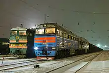 Diesel locomotives 2TE116-503 (left) and 2TE116U-0024 at Likhaya