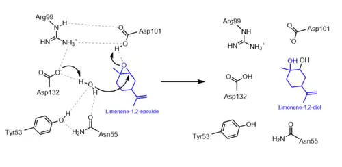 - 1 2 3 Hou QQ, Sheng X, Wang JH, Liu YJ, Liu CB (February 2012). "QM/MM study of the mechanism of enzymatic limonene 1,2-epoxide hydrolysis". Biochimica et Biophysica Acta (BBA) - Proteins and Proteomics. 1824 (2): 263–268. doi:10.1016/j.bbapap.2011.08.014. PMID 21925621.