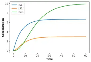 Plot shows a simulation of three intermediates from a four step pathway. The boundary species are fixed enabling the pathway to reach a steady state. Values k1 = 0.1; k2 = 0.15; k3 = 0.34; k4 = 0.1, Xo = 10, X1 = 0. S1, S2 and S3 are set to zero at time zero.