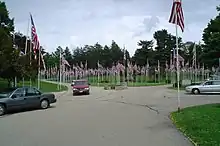 The cemetery is noted for the large gates at the entrance to the cemetery. The gates were given in memory of a local businessman and banker. It is also noted for the well cared for grounds, part of which sit on a bluff overlooking the Mississippi River.
