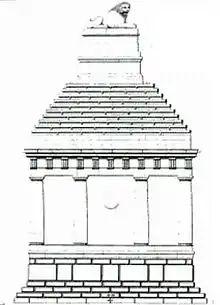 Pullan's sketch of his conjectural reconstruction of the funerary monument as first built. It is estimated to be 18 metres high and faced in marble. The lion weighs 6 tons.
