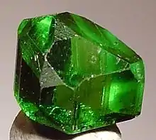 Campbell Bridges was a Scottish-born gemologist who spent most of his life in Africa. He discovered tsavorite in northeastern Tanzania in 1967. Tsavorite is a grossular variety of garnet, and its green color comes from trace amounts of vanadium. In 1970, he discovered deposits of tsavorite in Kenya, with transparent crystals large enough to be made into gemstones, and began selling the stones to Tiffany & Co. for jewelry within a few years. The stone is named after Tsavo West National Park in Kenya.[1]