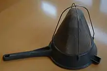 | Chinois | Chinoise | Straining substances such as custards, soups and sauces, or to dust food with powder | A conical sieve | ![]() |