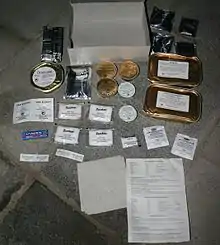 Most commonly it is packaged into a sturdy plastic blister box (nicknamed "The Frog" in the field for its olive-green color), or plastic-sealed cardboard box that contains five to six entrees in laminated foil cans or retort pouches, four to six pack of crackers or preserved bread, two to three dessert items in form of a spread or fruit bar, four beverage concentrate pouches, some seasonings (salt, pepper, sugar, ketchup), and various sundry items like sanitizing wipes/paper towels, spoons, can opener, four hexamine fuel tablets, folding heater, matches and water purifier tablets.[10] The types of entrees vary with the producer and the issued menu (of which there are usually 7 to 12), but the common set is based on a traditional Russian outdoorsmen fare, is largely formed out of the commercially available canned food, and usually includes 1 portion of stewed beef or pork, two meat-with-vegetables dishes, like various porridges, stews or canned fish, and one or two spreads, such as liver pâté, sausage stuffing or processed cheese. Desserts may include fruit jams, chocolate and/or walnut spreads, chocolate bars, sweetened condensed milk, etc., but baked goods are usually avoided out of concerns about their shelf life.[11] Other variants may add canned speck and/or dried fish or exchange the hexamine tablets for the flameless heater.