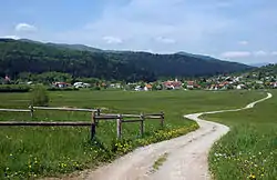 Little Obrh Spring (Slovene: Izvir Mali Obrh) lies on the south edge of the karst field in Kozarišče near Snežnik Castle and is fed by water from Mount Snežnik.[1][2] Big Obrh Spring (Slovene: Izvir Veliki Obrh) lies on the east side of the karst field, near Vrhnika pri Ložu, and is fed by water from Mount Race and the Potok Plateau in the Loški Potok area.[1][2] The streams from the two springs join west of Pudob[4] to create Obrh Creek, a losing stream that disappears on the north edge of the karst field into 850-meter (2,790 ft) Golobina Cave west of Dane, emerging to the west at Lake Cerknica.[5][6] Flooding affects only the western part of the karst field, below Dane, which is uninhabited. In the past, more of the karst field used to flood, and so at the end of the 19th century a lower entrance was cut into the cave, which reduced the depth and duration of flooding.