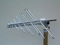 In general terms, at any given frequency the log-periodic design operates somewhat similar to a three-element Yagi antenna; the dipole element closest to resonant at the operating frequency acts as a driven element, with the two adjacent elements on either side as director and reflector to increase the gain, the shorter element in front acting as a director and the longer element behind as a reflector. However, the system is somewhat more complex than that, and all the elements contribute to some degree, so the gain for any given frequency is higher than a Yagi of the same dimensions as any one section of the log-periodic. However, a Yagi with the same number of elements as a log-periodic would have far higher gain, as all of those elements are improving the gain of a single driven element. In its use as a television antenna, it was common to combine a log-periodic design for VHF with a Yagi for UHF, with both halves being roughly equal in size. This resulted in much higher gain for UHF, typically on the order of 10 to 14 dB on the Yagi side and 6.5 dB for the log-periodic.[5] But this extra gain was needed anyway in order to make up for a number of problems with UHF signals.