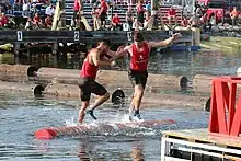 Log rolling, sometimes called birling, is a Sparring Sport involving two competitors, each on one end of a free-floating log in a body of water. The athletes battle to stay on the log by sprinting, kicking the log, and using a variety of techniques as they attempt to cause the opponent to fall off.[1]