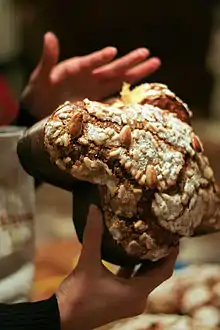 Other famous sweets of the region are Cremona nougat (turòon),[26] according to the legend created by local confectioners for the wedding of Francesco Sforza and Bianca Maria Visconti, and amaretti di Saronno, crispy cookies made of almonds, albumen and armelline. Probably influenced by Piedmontese confectionery are baci di Cremona, similar to baci di dama but with a crispy cookie made of hazelnut flour, and baci del Signore di Pavia, more flattened, filled with orange marmalade and half covered with melted chocolate.[27] Among other cookies we have offelle di Parona, sometimes prepared with rice flour, mostaccini, a Cremonese cookie prepared with the addition of, among other spices, clove, mace, coriander and star anise, biscottini di Prosto, a cookie with a high content of butter cooked twice in the oven typical of Valchiavenna.