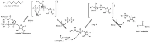 Long chain fatty acyl-CoA synthetase, LC-FACS, plays a role in the physiological regulation of various cellular functions via the production of long chain fatty acyl-CoA esters, which reportedly have affected protein transport, enzyme activation, protein acylation, cell signaling, and transcriptional regulation.[1] The formation of fatty acyl-CoA is catalyzed in two steps: a stable intermediate of fatty acyl-AMP molecule and then the product is formed—fatty acid acyl-CoA molecule.[4]