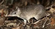 The long-nosed bandicoot is the largest member of its genus, which also includes the eastern barred bandicoot and the western barred bandicoot.[7] It is most closely related to the eastern barred bandicoot, the two species having diverged from one another in the late Pliocene. Their ancestors diverged from the ancestor of the western barred bandicoot in the Miocene.[8]