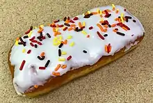 The Long John is a bar-shaped, yeast risen[1] doughnut either coated entirely with glaze or top-coated with cake icing. They may be filled with custard or cream. The term Long John is used in the Midwestern U.S.[2] and Canada, and has been used in Texas.[3]